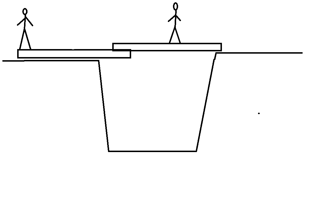 Сначала один ставит доску на одной стороне чуть выдвинув ее, чтобы длины второй было достаточно для перекрытия траншеи, затем второй перейдя на другую сторону поступает подобным же образом, обеспечив переход первому.