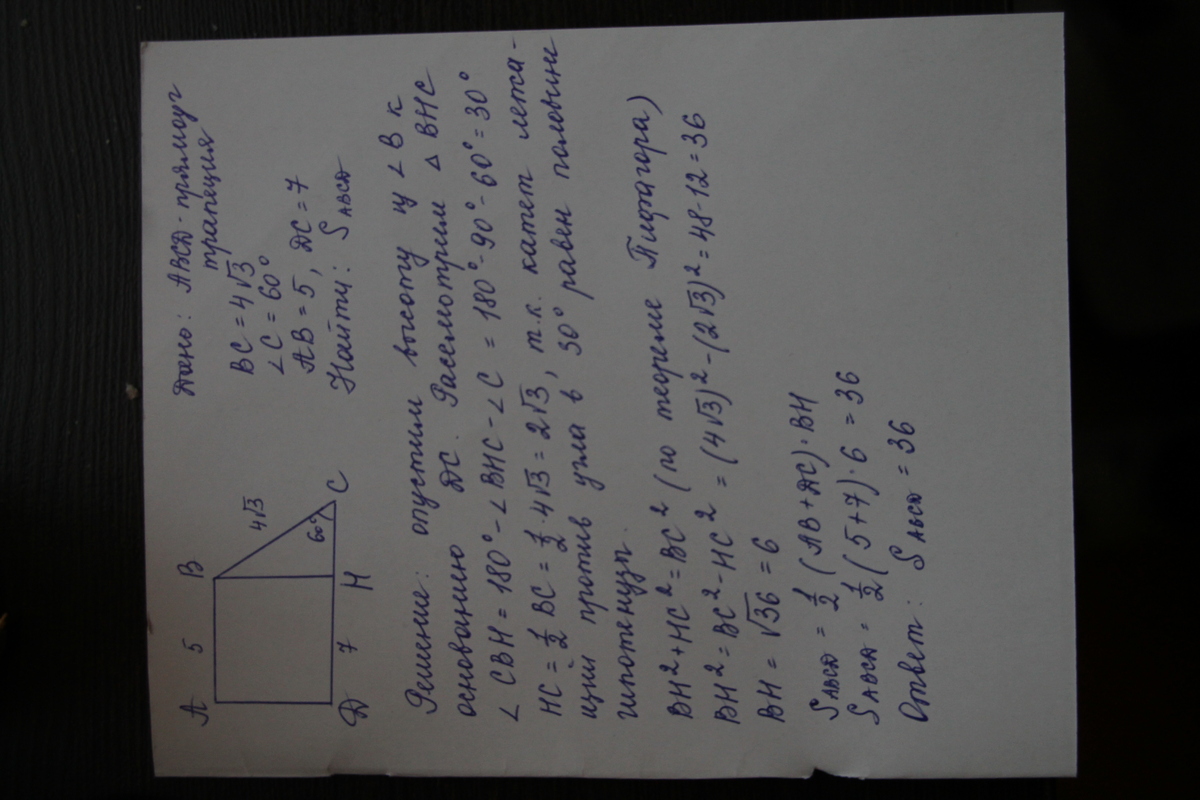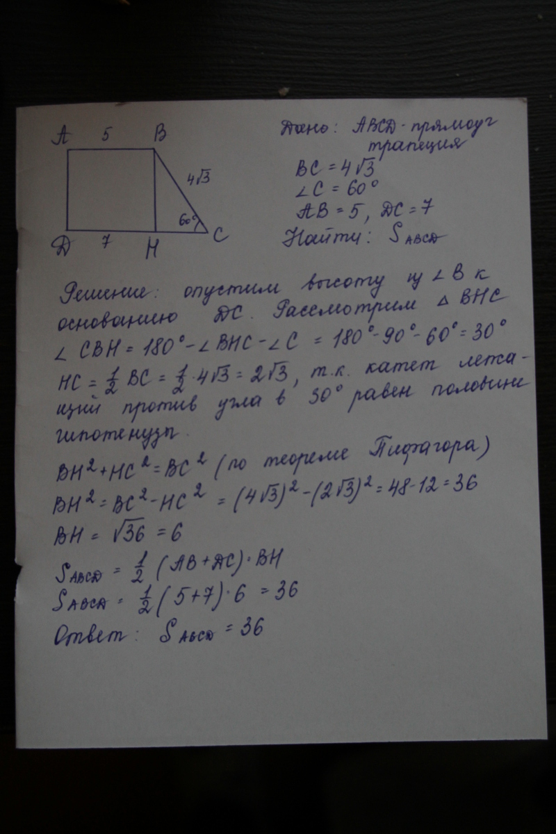 Боковая сторона прямоугольной трапеции равна 4 корня из 3, а один из прилегающих к ней углов равен 60 градусов. Найдите площадь трапеции, если ее основания равны 5 и 7