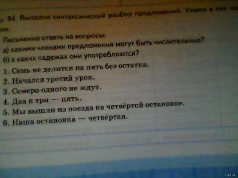1. Семь (подлежащее; числительное) не делится (сказуемое; глагол) на пять (дополнение; числительное) без остатка (дополнение; существительное).