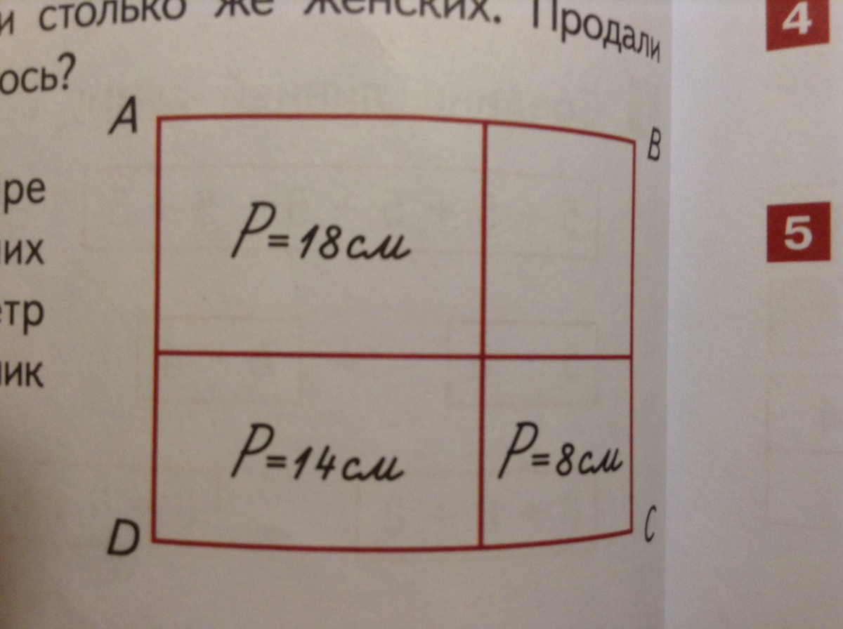 Прямоугольник abcd разбит на четыре прямоугольника. Периметры трех из них указаны на чертеже. Вычисли периметр прямоугольника abcd, если прямоугольник с периметром 8см-квадрат.