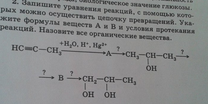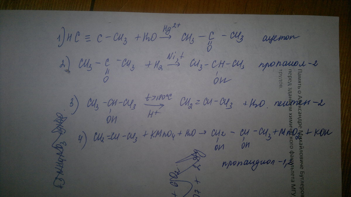 1) CH3-C(три палочки)CH + H2O -Hg[+2],H[+]-> CH3-CO-CH3 (ацетон)