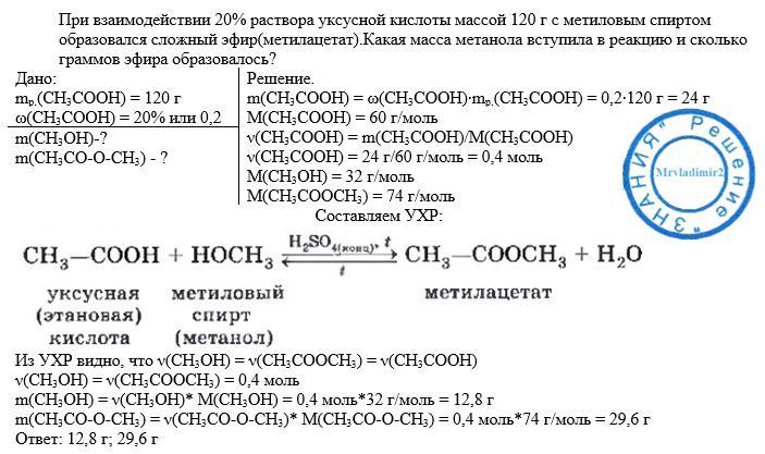 при взаимодействии 20% раствора уксусной кислоты массой 120г с метиловым спиртом образовался сложный эфир(метилацетат).Какая масса метанола вступила в реакцию и сколько граммов эфира образовалось?