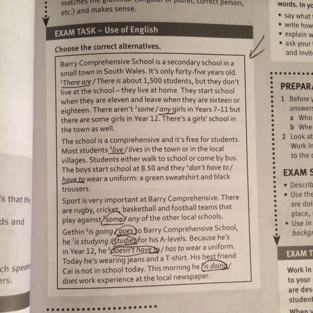 Barry Comprehencive school это средняя школа в небольшом городе в Южном Уэльсе. Ей всего 45 лет. Там около 1500 студентов/учеников, но они живут не в школе а дома. Они начинают ходить в школу когда им 11 а заканчивают когда им 16 или 18. В годах/(группах) 7-11 нет девушек, но есть несколько в 12-ом. В городе есть школа для девушек. Школа всесторонняя/(общеобразовательная) и бесплатна для учеников. Большинство учеников живет в городе и ближайших деревнях. Ученики или идут в школу пешком или едут на автобусе. Мальчики начинают учиться в 8.50 и им необходимо носить форму - зеленую фуфайку и черные штаны. Спорт очень важен для Barry Comprehencive. Там есть сборные по регби, крикету, баскетболу и футболу, которые играют против сборных других местных школ. Gethin ходит в Barry Comprehencive, он учится на оценки уровня А. Ему не обязательно носить форму потому, что он из группы 12 года. Сегодня он носит футболку и джинсы. Его лучший друг Cai сегодня не в школе. Этим утром он делает практическую работу для местной газеты.
