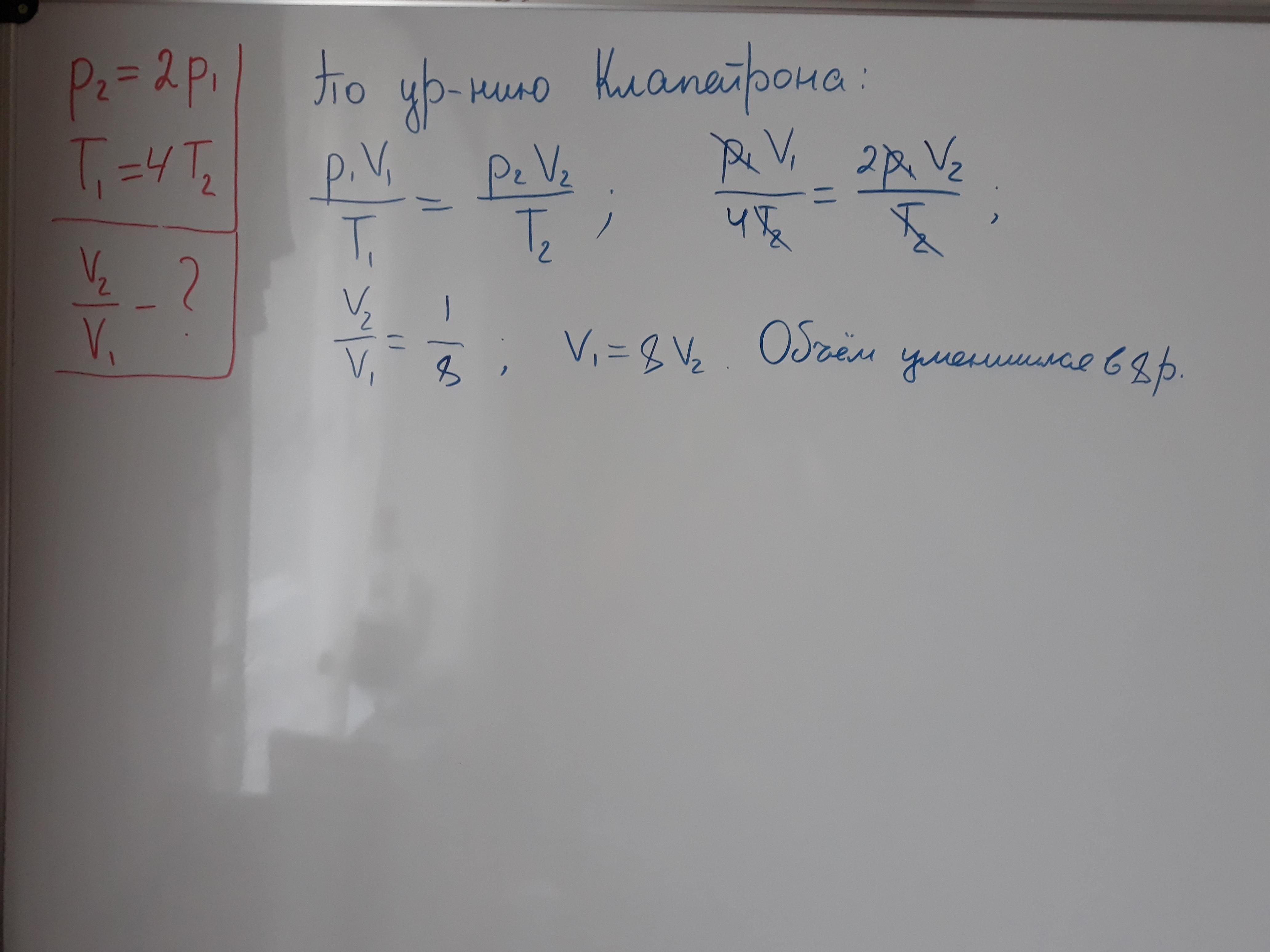 Давление данной массы идеального газа увеличилась в 2 раза, а его абсолютная температура уменьшилась в 4 раза. Как изменился при этом объем газа?