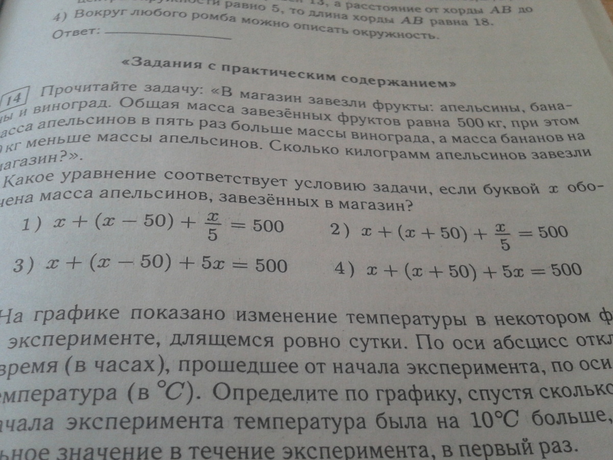 Прочитайте задачу: "В магазин завезли фрукты : апельсины,бананы и виноград.Общая масса завезенных фруктов равна 500 кг,при этом масса апельсинов в 5 ряз больше массы винограда,а масса бананов на 50 кг меньше массы апельсинов.Сколько килограмм апельсинов завезли в магазин?"