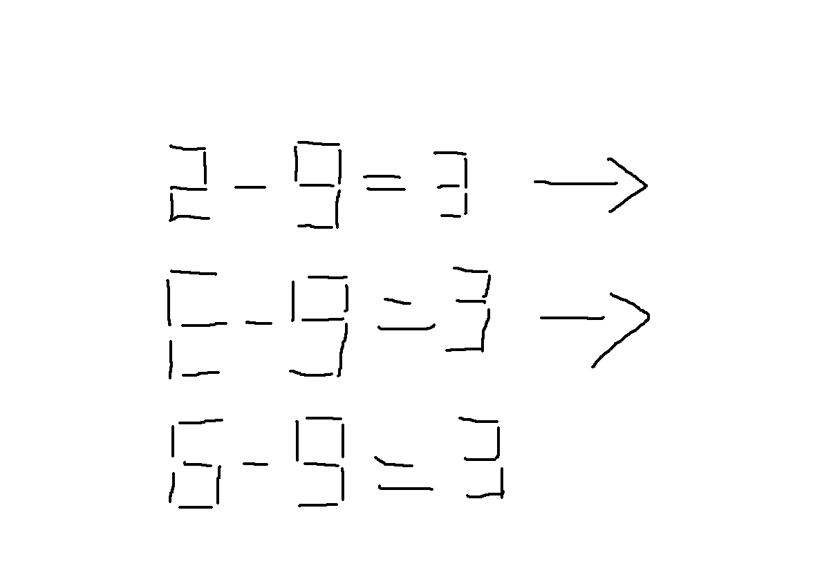 1.От числа 9 нужно переставить спичку ,чтобы получилось число три,а вместо знака минус плюс.2.Число три нужно исправить на число пять,переставив спичку в право.3.Получится 2+3=5