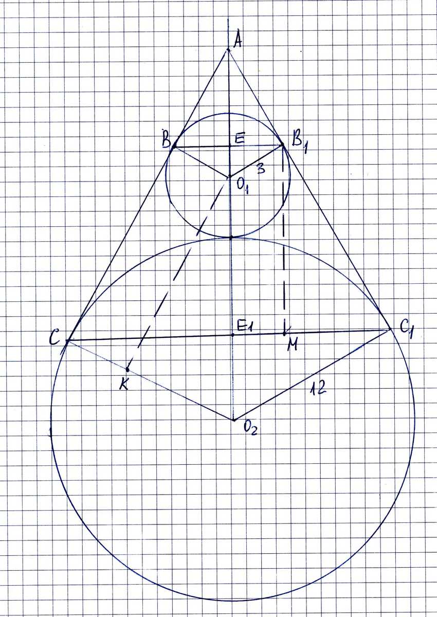 У этого прямоугольного треугольника стороны О2О1 = 15, КО2 = 12 - 3 =9, то есть это египетский треугольник, подобный (3,4,5). И ВСЕ ОСТАЛЬНЫЕ ПРЯМОУГОЛЬНЫЕ ТРЕУГОЛЬНИКИ - ТОЖЕ!!!! Ну, конечно, можно было бы и про синусы вспомнить, но это - равносильно :)))