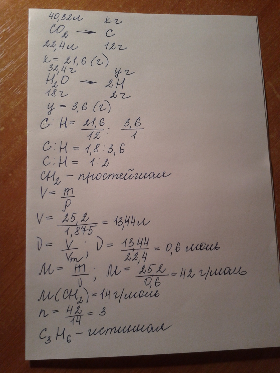 определите молярную формулу углеводорода, если при сжигании 25.2 его образовалось 40.32л оксида углерода (IV) (ну) и 32.4 г воды плотность этого вещества равна 1.875