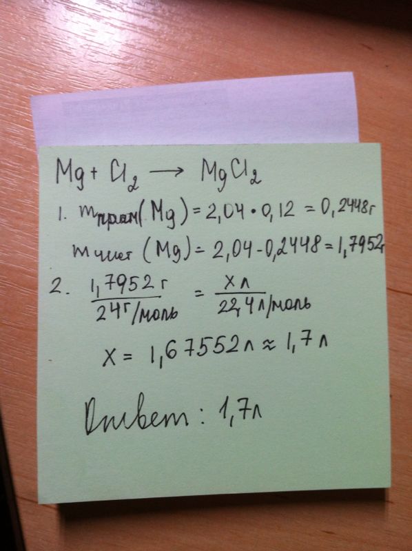 Магний массой 2,04 содержащий 12% примесей, полностью сгорел в хлоре. Найдите объем хлора (н.у) вступившего в реакцию
