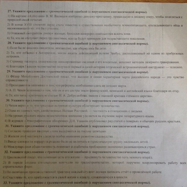 27 - 1 (изобразил девушку-крестьянку, которая пришла к лесному озеру, чтобы поделиться с природой своей печалью), 28 - 4 (Благодаря Галилею), 29 - 4 (Те, кто читал..., знакомы...), 30 - 3 (уделяется изучению), 31 - 4 (озабочена проблемами, понимает не нужно), 32 - 3 (По окончании), 33 - 4 (Скоро будет заселён дом, выросший на глазах за несколько месяцев и принятый комиссией), 34 - 4 (говоря: "В свой жестокий век восславил я свободу"), 35 - 1 (не только для опубликования научных работ, но и для внедрения их в практику), 36 - 2 (Это произведение Василя Быкова, посвящённое Великой Отечественной Войне, я прочитал летом), 37 - 2 (благодаря которым), 38 - 4 (По окончании института), 39 - (Все, кто ..., знают ...), 40 - (неоднократно отмечали то, что ...), 41 - 2 (Девушка, которая сидела у окна и хорошо пела, запомнилась всем).