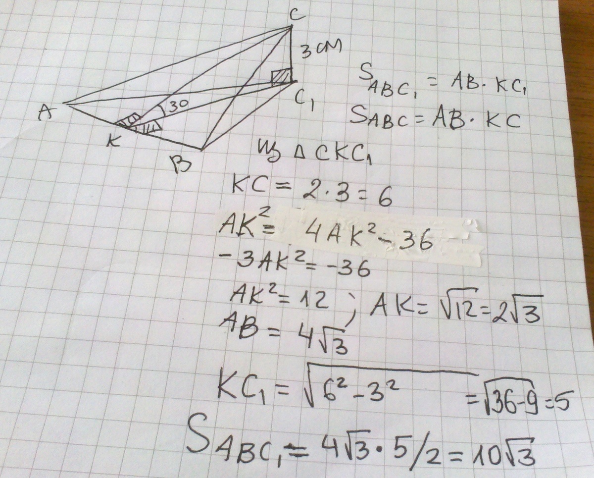 Сторона AC равностороннего треугольника ABC лежит в плоскости α, а вершина B удаленна от этой плоскости на 3 см.Угол между плоскостями ABC и α равен 30. Найдите площадь ортогональной проекции треугольника ABC на плоскость α. С рисунком пожалуйста.