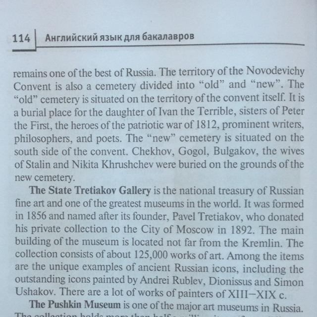 Государственная Третьяковская галерея это национальная сокровищница русской живописи и один из величайших музеев в мире. Она создана в 1856 году и названа по имени основателя, Павла Третьякова, который пожертвовал свою частную коллекцию городу Москве в 1892 году. Главное здание музея расположено недалеко от Кремля. Собрание состоит из более 125000 работ живописи. Среди образцов есть уникальные экземпляры древних русских икон, включая выдающиеся иконы, написанные Андреем Рублевым, Дионисием, и Симоном Ушаковым. Множество работ художников 13- 19 веков там.