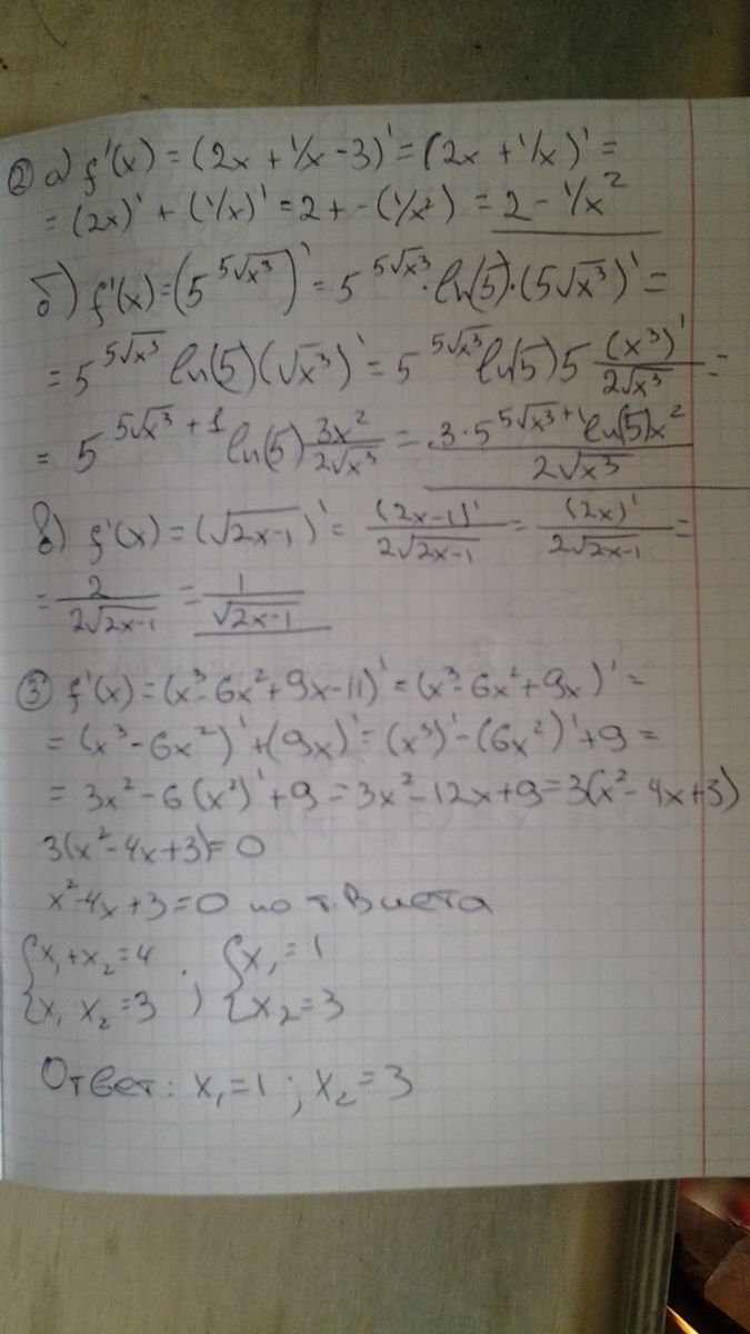 2)Найдите f'(x) если a) f(x)=2x+1/x-3 б)f(x)=5^5корень x^3 в)f(x)=корень2x-1