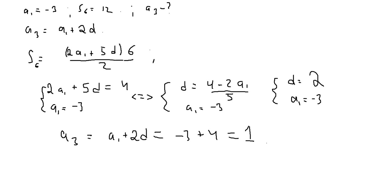 В арифметической прогрессии первый член равен -3 а сумма первых шести членов равна 12. Найдите третий член прогрессии. прошу с полным решением (Я эту тему в школе пропустила,а теперь не могу понять)