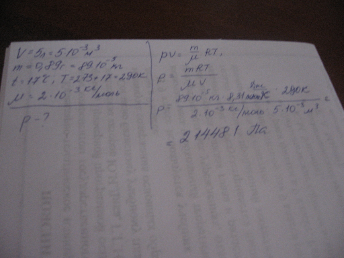 В сосуде вместимостью 5 л содержится 0,89 г водорода при температуре 17 С. Определите давление водорода.(М=1г/моль)