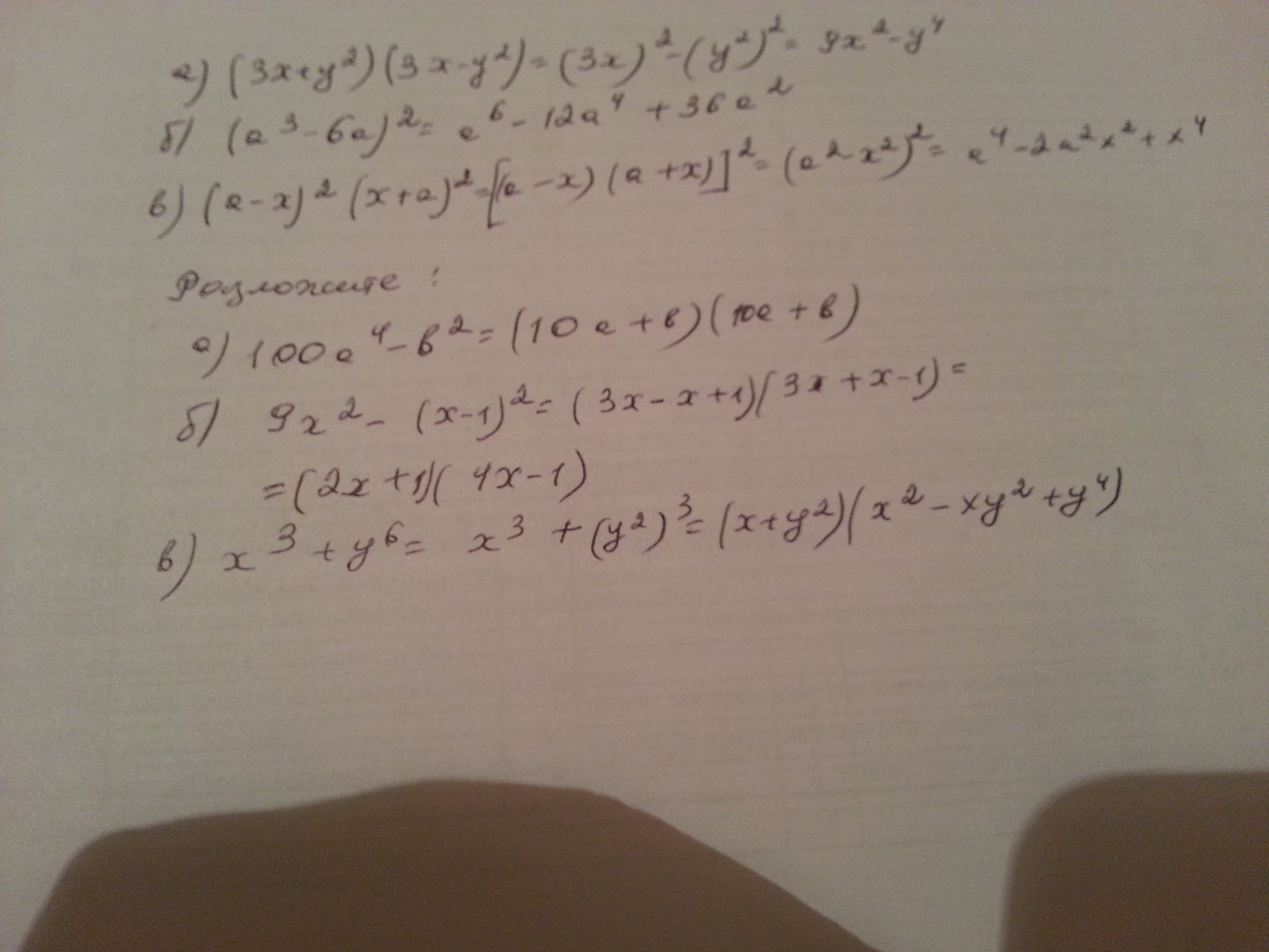 Выполните действия: а) (3х + у2) (3х - у2); б) (а3 - 6а)2; в) (а - х)2 (х + а)2.6. Разложите на множители: а) 100а4 - b2 ; б) 9х2 - (х - 1)2; в) х3 + у6