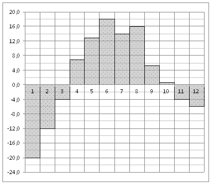 На диаграмме показана среднемесячная температура воздуха в Екатеринбурге (Свердловске) за каждый месяц 1973 года. По горизонтали указываются месяцы, по вертикали — температура в градусах Цельсия. Определите по диаграмме разность между наибольшей и наименьшей среднемесячными температурами в 1973 году. Ответ дайте в градусах Цельсия.
