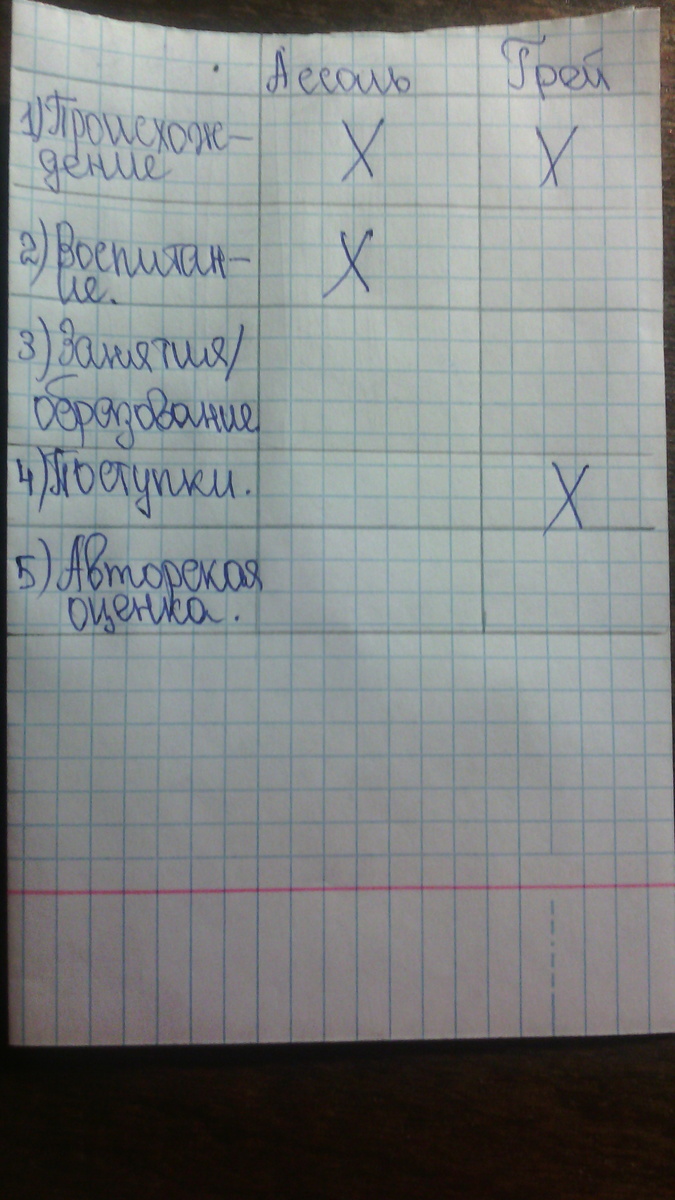 Читала это произведение, два года назад летом и поэтому могу перепутать ин-фу! Ассоль вроде не из благополучной семьи. Очень рано потеряла мать. Помню, что она пускала миниатюру корабля с красными парусами в море. Девушка, она очень добрая и отзывчивая. В конце произведения автор подарил ей подарок судьбы. Грей, напротив, в его семье был доход... Это всё, что могу сказать. по этим данным заполнить таблицу. надеюсь помогла!)