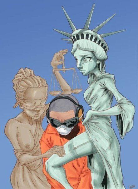 а теперь к делу! Данная карикатура иллюстрирует, как обычного человека, который, как мы видим, ничего не слышит, ничего не видит и ничего не может сказать, совращает с одной стороны демократические "идеалы "США, которые уже давно не являются примером для подражания, а с другой мы видим судебную систему и на сколько он развращена и корумпирована. И если можно сказать, что на человеке уже тюремная одежда, то это свидетельствует о том, что в любом случае его права и свободы не зависят от выбора и он в итоге окажется их лишен!