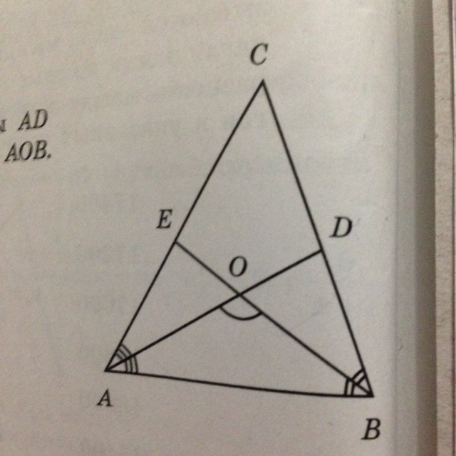 В треугольнике abc угол c=52 градусов, биссектрисы ad и be пересекаются в точке Q. Найдите угол AOB. Ответ дайте в градусах.