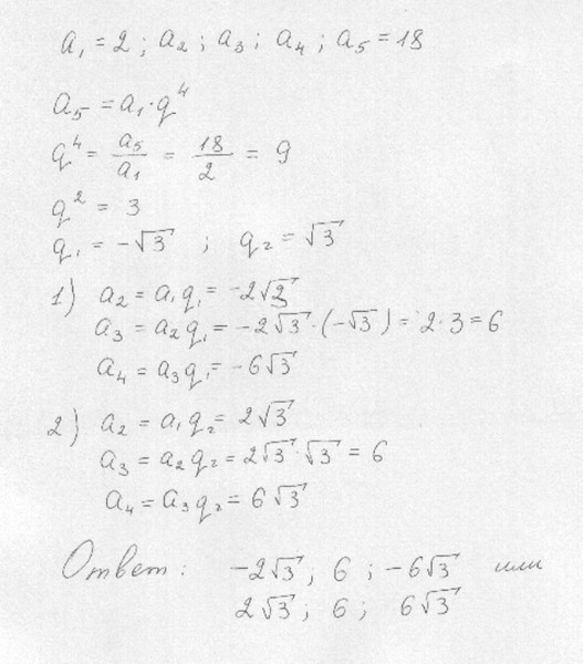 между числами 2 и 18 вставьте три числа так, чтобы вместе с данными они образовали геометрическую прогрессию