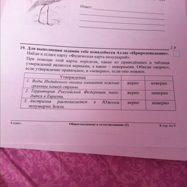 Воды Индийского океана омывают южные границы нашей страны? Территория Российской Федерации находится в Евразии? Австралия располагается в Южном полушарии Земли?