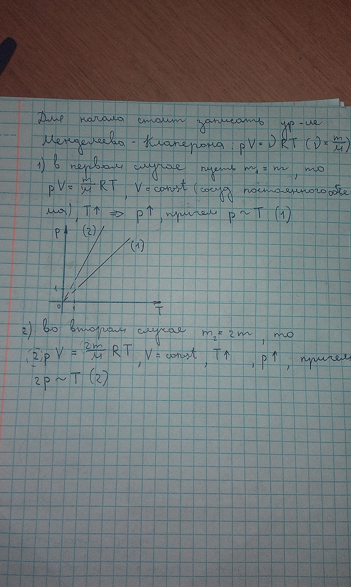 В сосуде постоянного объема производится нагревание газа , другой раз нагревают этот газ в два раза большей массы. Начертите зависимость давление от температуры для этих двух случаев.