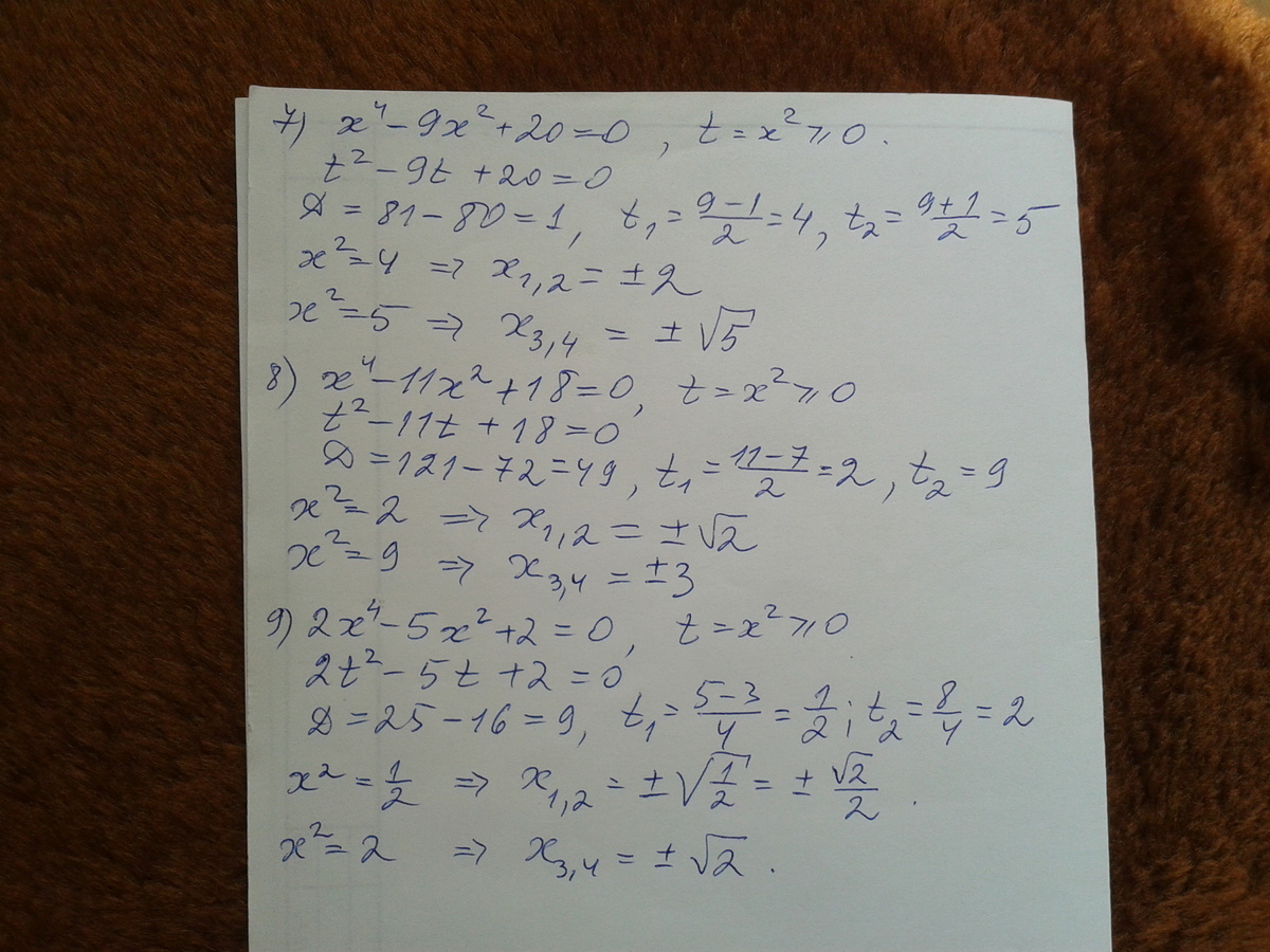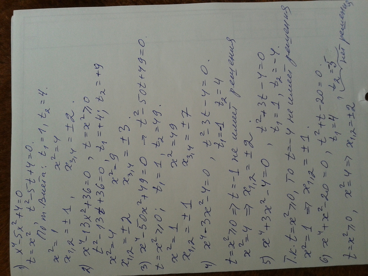 Помогите решить уравнения ! Тема была - уравнения сводящиеся к квадратным ! 1) x^4-5x^2+4=0 2) x^4-13x^2+36=0 3) x^4-50x^2+49=0 4) x^4-3x^2-4=0 5) x^4+3x^2-4=0 6) x^4+x^2-20=0 7) x^4-9x^2+20=0 8) x^4-11x^2+18=0 9) 2x^-5x^2+2=0