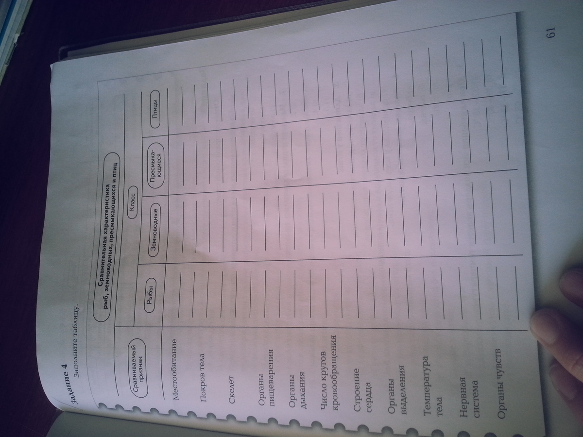 1. местообитание: рыбы(далее р) вода; земноводные (далее з) личинки в воде, взрослые особи на суше; пресмыкающиеся (далее пр) вторичное возвращение в воду (крокодилы, черепахи) и суша(змеи, ящерицы); птицы (далее пт) суша, воздух.