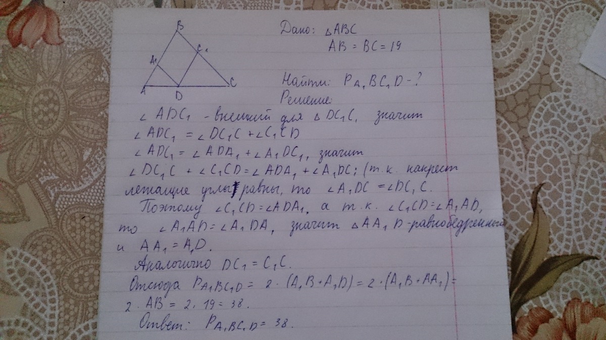 Боковая сторона равнобедренного треугольника равна 19.Из точки взятой на основании этого треугольника проведены две прямые параллельные боковым сторонам.Найдите периметр получившегося параллелограмма.