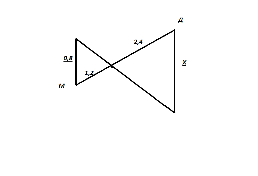 На рисунке изображены детские качели. На конце короткого "плеча" сидит мальчик,а на конце длинного-девочка. На сколько метров опустится девочка,если мальчик поднимется на 0,8 м?( мальчик 1,2м , а девочка 2,4м)
