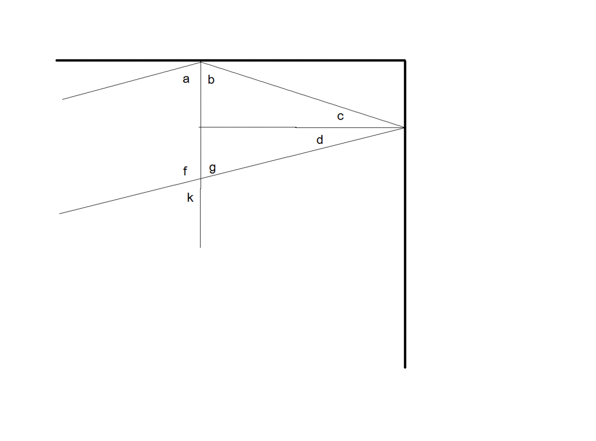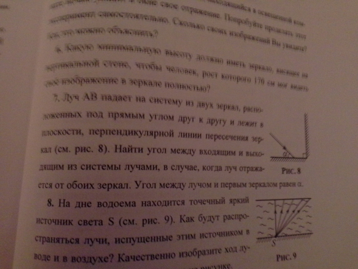 Луч ABпадает на систему из двух зеркал, расположенных под прямым углом друг к другу и лежит в плоскости, перпендикулярной линии пересечения зеркал. Найти угол между входящим и выходящим из системы лучами, в случае, когда луч отражается от обоих зеркал. Угол между лучом и первым зеркалом равен а