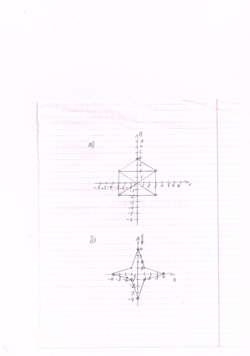 Постройте фигуру последовательно соединив отрезками точки с координатами: а) (3;-2), (-3;-2), (-3;2), (0;4), (3;2), (3;-2), (-3;2), (3;2), (-3;-2) б) (4;0), (1;-1), (0;-4), (-1;-1), (-4;0), (-1;1), (0;4), (1;1), (4;0)