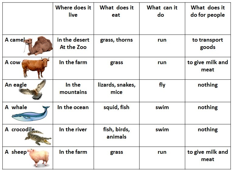 заполни таблицу where does it live what does it eat what can it do what does it do for people a camel a cow an eagle a whale a crocodile a sheep