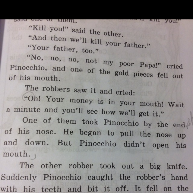 "О! Его деньги у него во рту! Погоди-ка, сейчас мы посмотрим, как их достать". Один из них взял Пиноккио за кончик носа и тянул его вверх и вниз. Но Пиноккио рот не открывал.