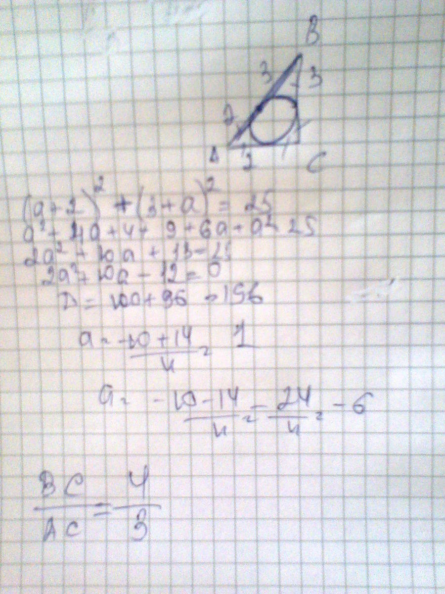 Найдите отношение катетов прямоугольного треугольника, если известно, что точка касания вписанной окружности делит гипотенузу в отношении 2:3.