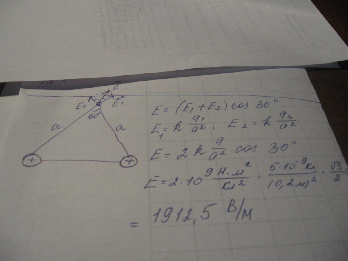 Е= √3 * k *q1/R^2=1,7*9*10^9*5*10^-9/4*10^-2=1912,5 В/м