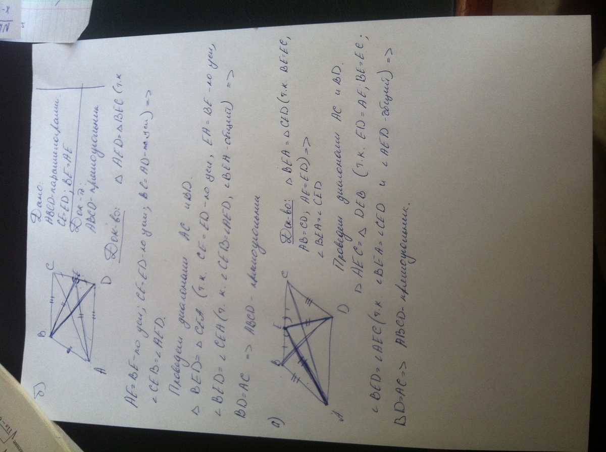 2)В параллелограмме ABCD точка Е - середина стороны СD. Известно, что ЕА = ЕB. Докажите, что данный параллелограмм - прямоугольник.