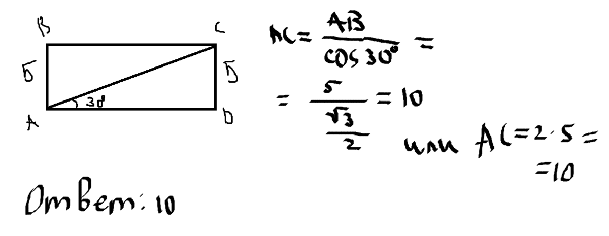 Менша сторона прямокутника дорівнює 5 см. Знайдіть довжину діагоналі,якщо вона утворює з більшою стороною кут 30 градусів.