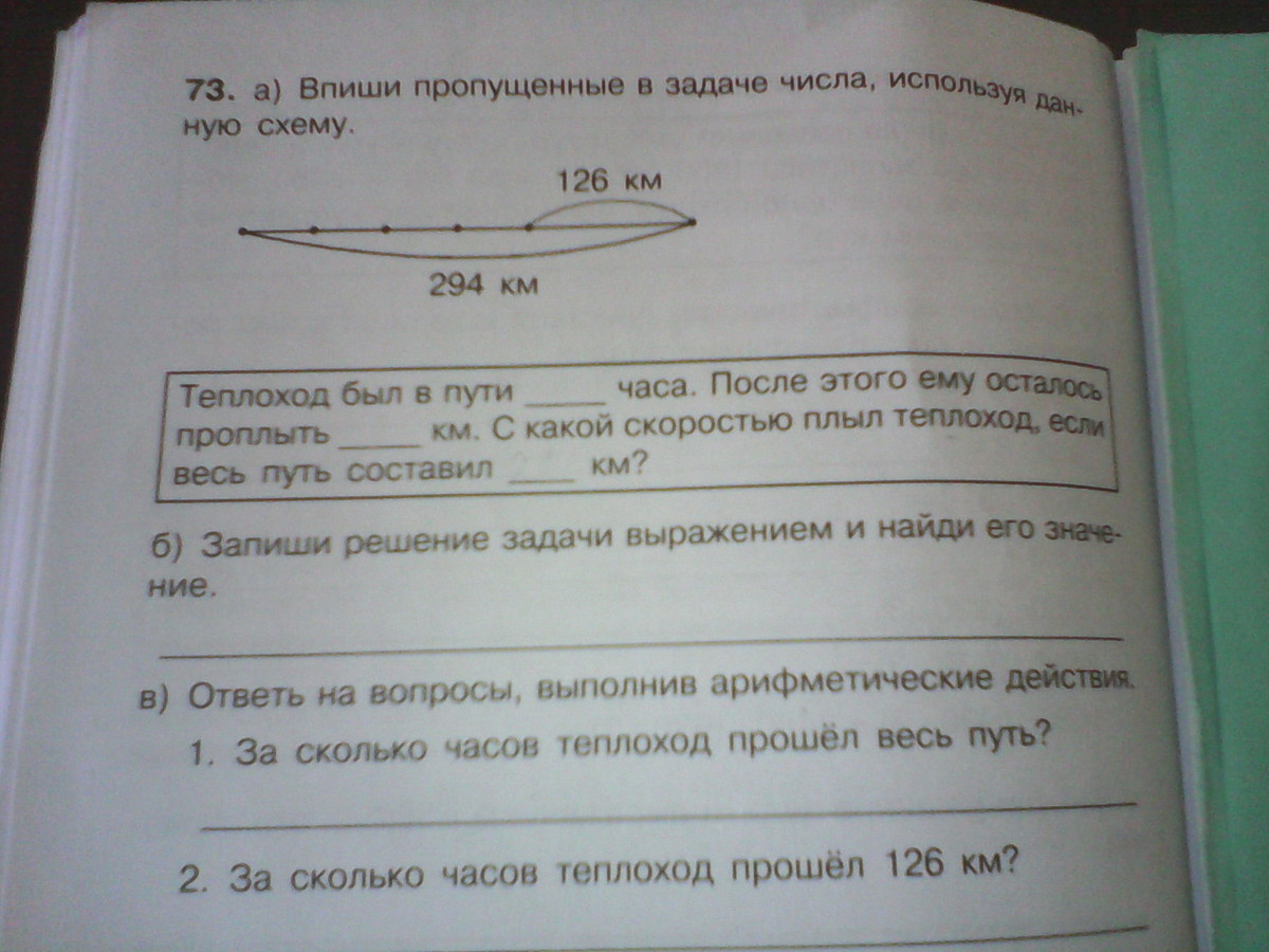 Теплоход был в пути 4 часа. После этого ему осталось проплыть 126км. С какой скоростью плыл теплоход, если весь путь составил 294км?