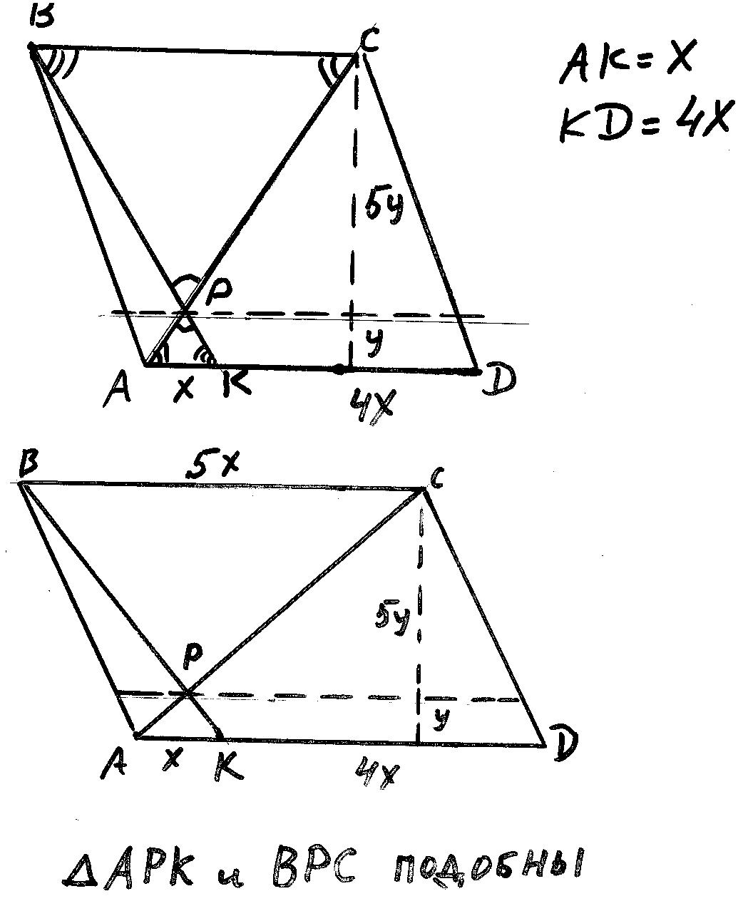 Треугольники АРК и ВРС подобны (смотри рисунок) по трём углам(вертикальный и накрест лежащие). Пусть АК=Х, тогда КД=4Х, а ВС=АД=Х+4Х=5Х. ВС/АК=5Х/Х=5. Это и есть коэффициент подобия. Следовательно если высота треугольника АРК равна У, то высота треугольника ВРС равна 5У. Найдём площади. Sарк=1/2*Х*У=1. Тогда Х*У=2. Площадь параллелограмма равна Sавсд=АД*Н=5Х*6У=30Х*У. Подставляем значение Х*У=2, получим Sавсд=30*2=60. Эта задача интересна тем, что при заданном условии можно построить множество параллелораммов с площадью=60(на рисунке в качестве примера представлено два). Если интересно могу написать как это делается.