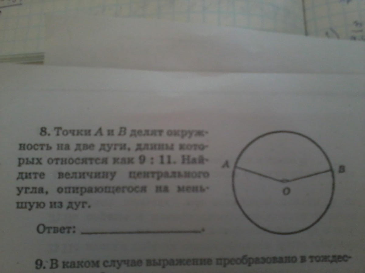 Точки А и В делят окружность на две дуги ,длины которых относятся как 9 : 11 . Найдите величину центрального угла,опирающегося на меньшую из дуг.