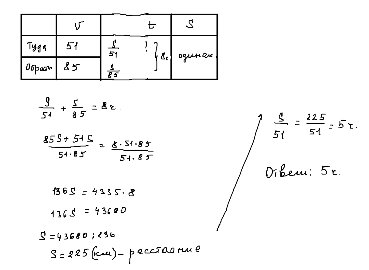 за S я обозначила расстояние между городами. Когда машина ехеда со скоростью 51 км/ч, то было затрачено времени S/51 часов (t=S:v). Аналогично, обратно было затрачено времени S/85 часов. Всего на поездку туда и обратно было потрачено 8 часов. Составляем уравнение..... Приводим к общему знаменателю и решаем.