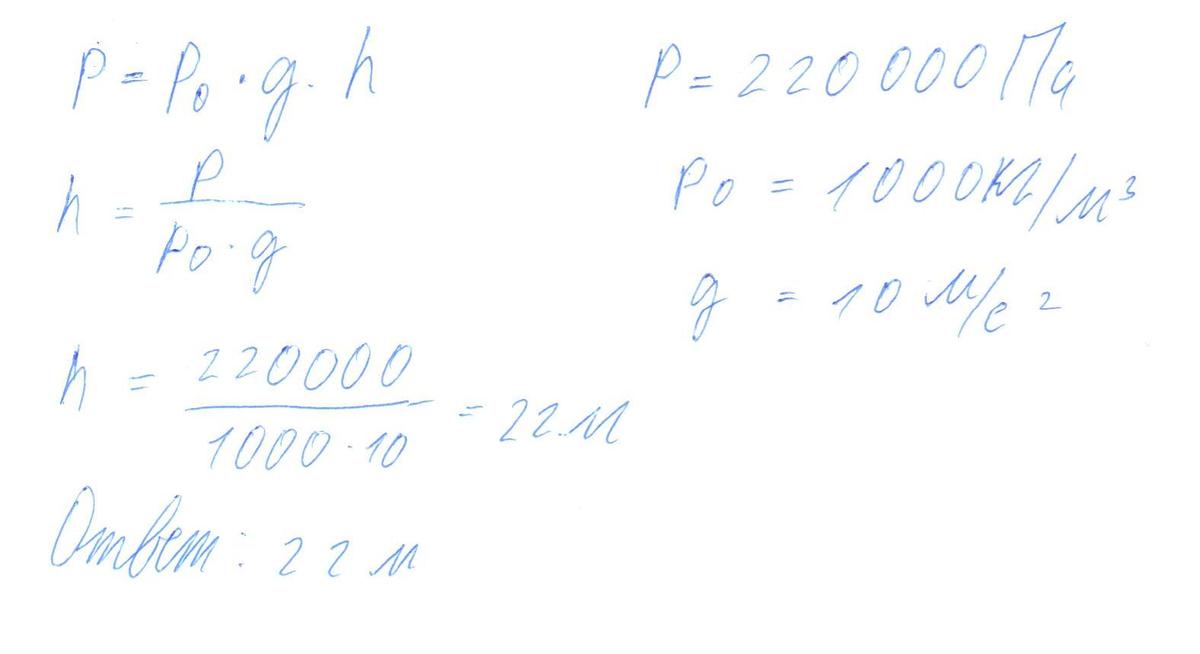 Определите высоту уровня воды в водонапорной башне, если манометр, установленный у ее основания показывает давление 220 кПа.
