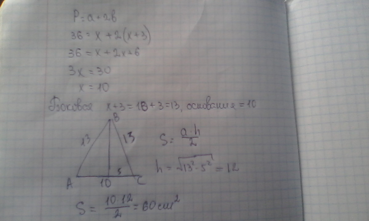 периметр рівнобедренного трикутника дорівнює 36 см. знайдіть площу трикутника, якщо його бічна сторона на 3 см більше від основи