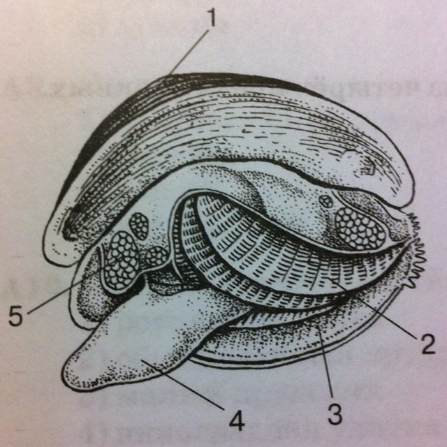 Строение двустворчатого моллюска. Напишите названия частей тела двустворчатого моллюска, обозначенных цифрами.