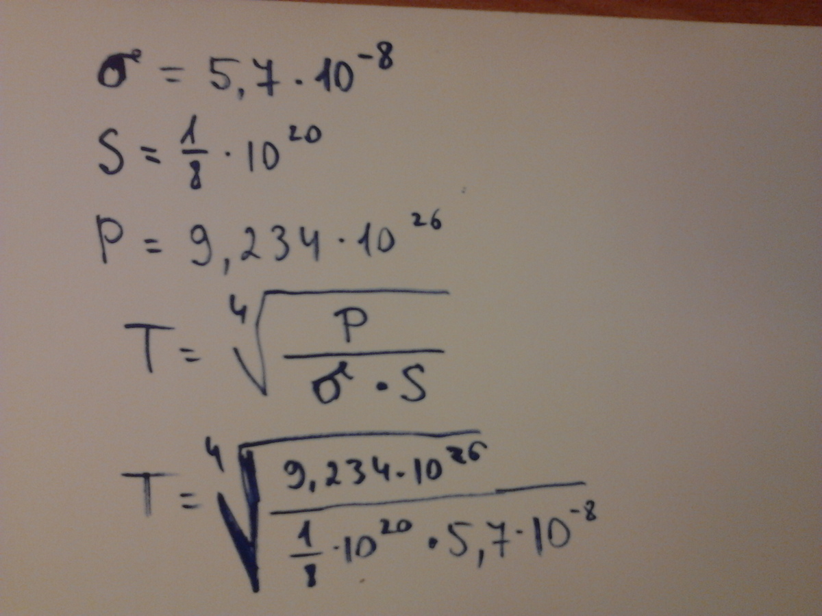 sqrt[4]{frac{9.234*10^{26}}{frac{1}{8}*10^{20}*5.7*10^{-8}}}=sqrt[4]{frac{8*9234*10^{23}}{57*10^{11}}}=sqrt[4]{frac{2^{4}*3^{5}*19*10^{23}}{57*10^{11}}}=sqrt[4]{2^4*3^4*10^{12}}=\