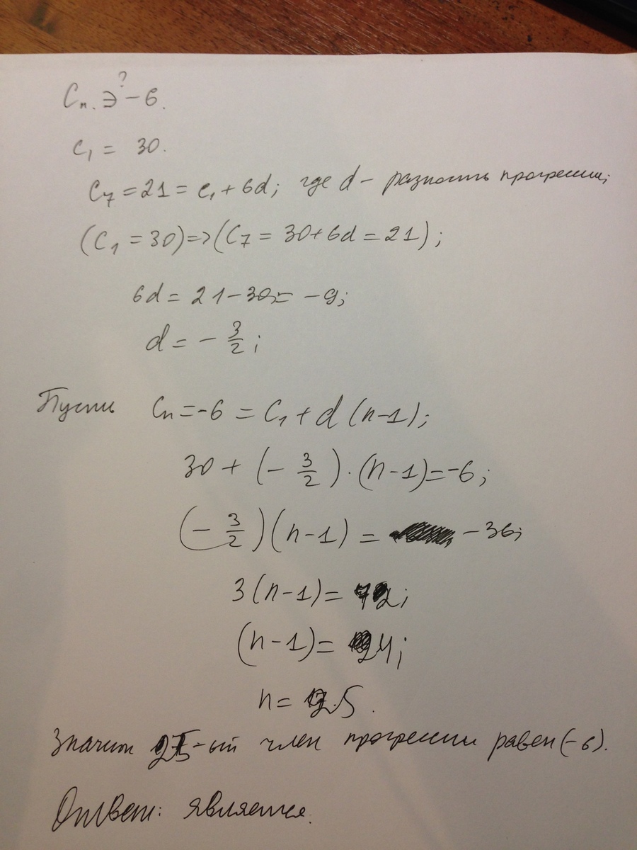 Является ли число -6 членом арифметической прогрессии (Cn)? в которой с1=30 и с7=21?