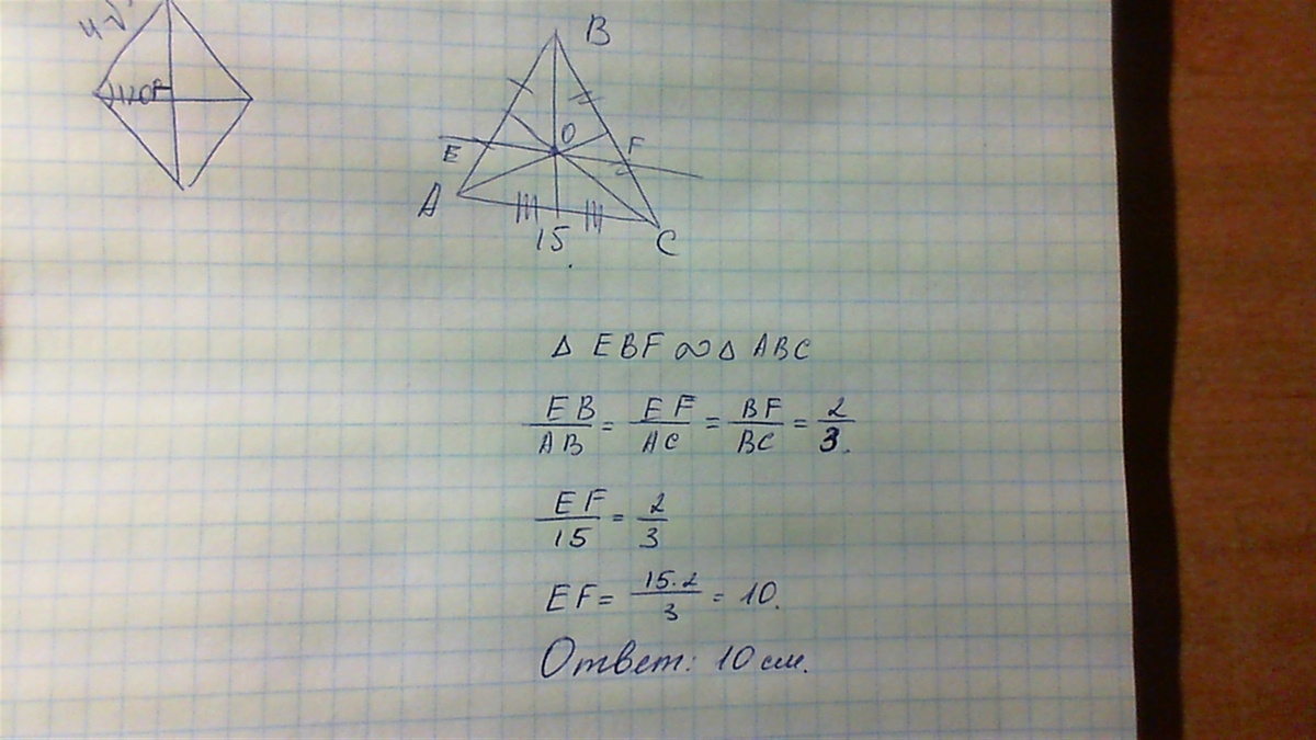 медианы треугольника ABC пересекаются в точке O. Через точку O проведена прямая, параллельная стороне AC и пересекающая стороны AB и BC в точка E и F соответственно. Найдите EF, если сторона AC равна 15 см.