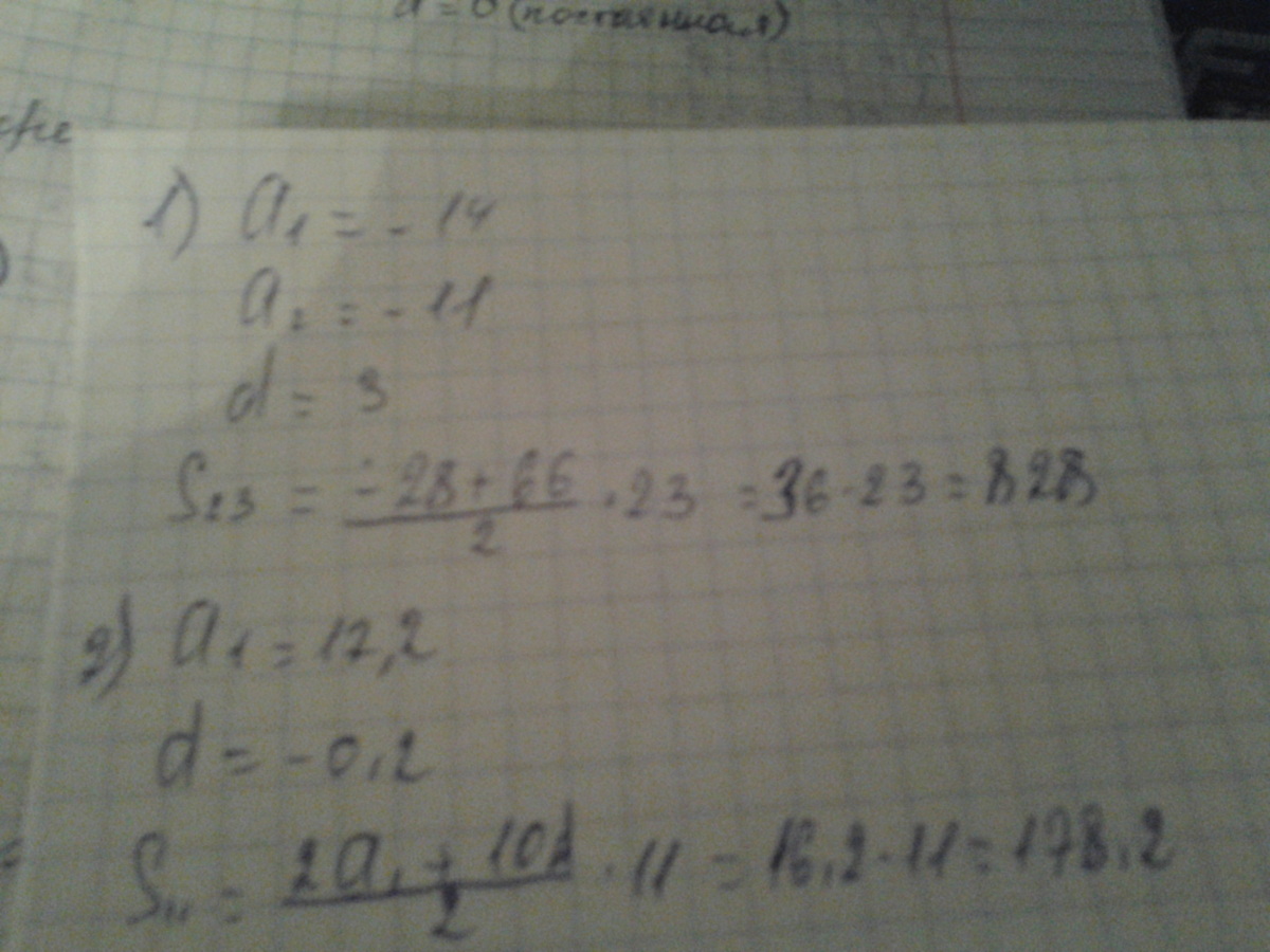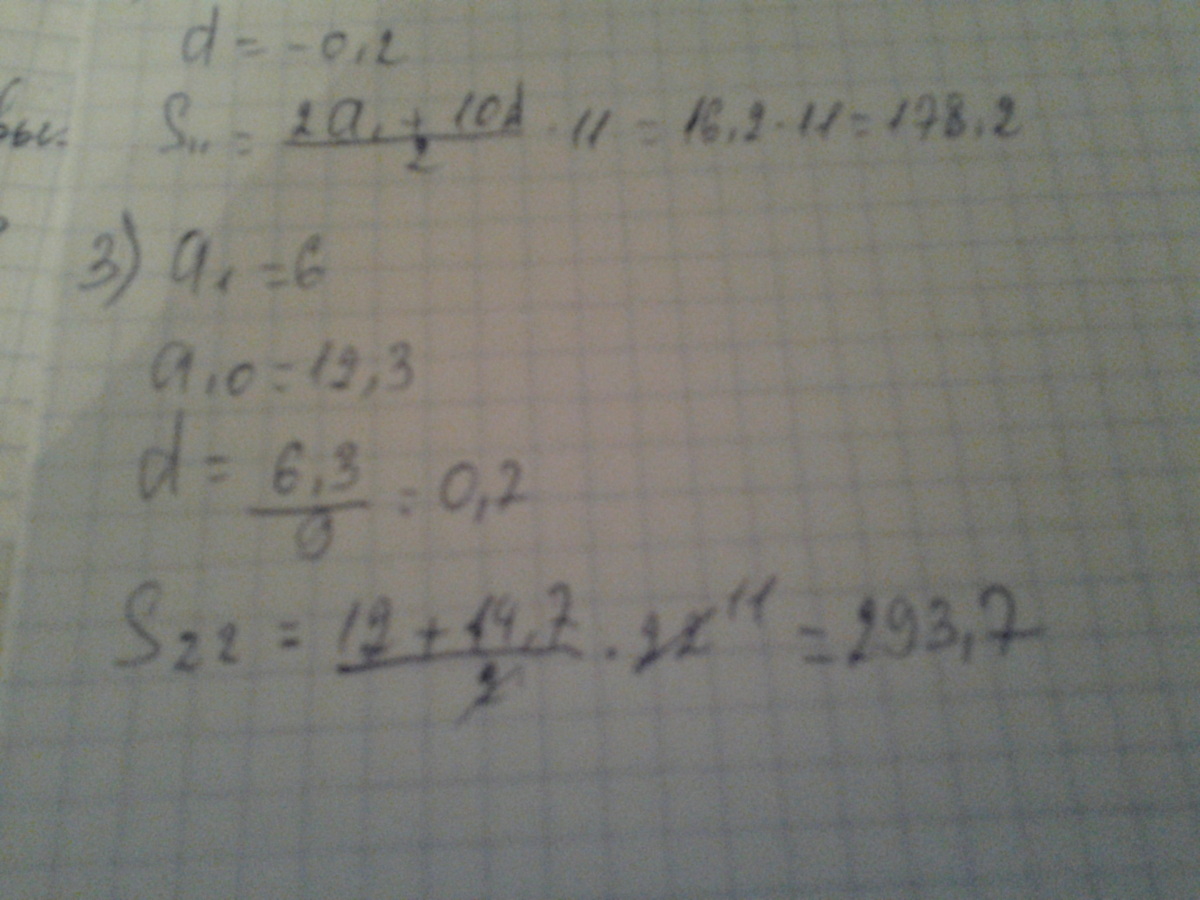 1) найдите сумму двадцати трех первых членов арифметической прогрессии -14;-11.. 2)Найдите сумму одиннадцати первых членов арифметической прогрессии (An),если А1=17,2. d=-0,2 3)Найдите сумму двадцати двух членов арифметической прогрессии (An),если А1=6,А10=12,3